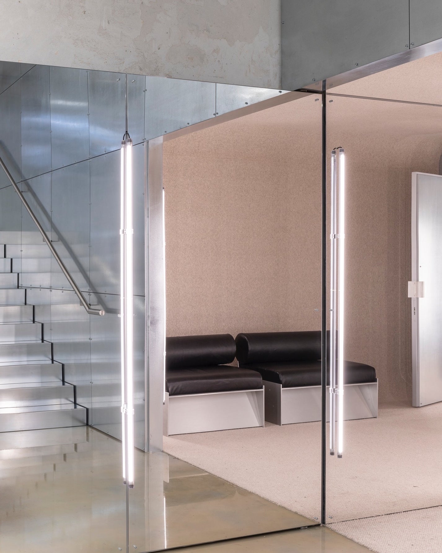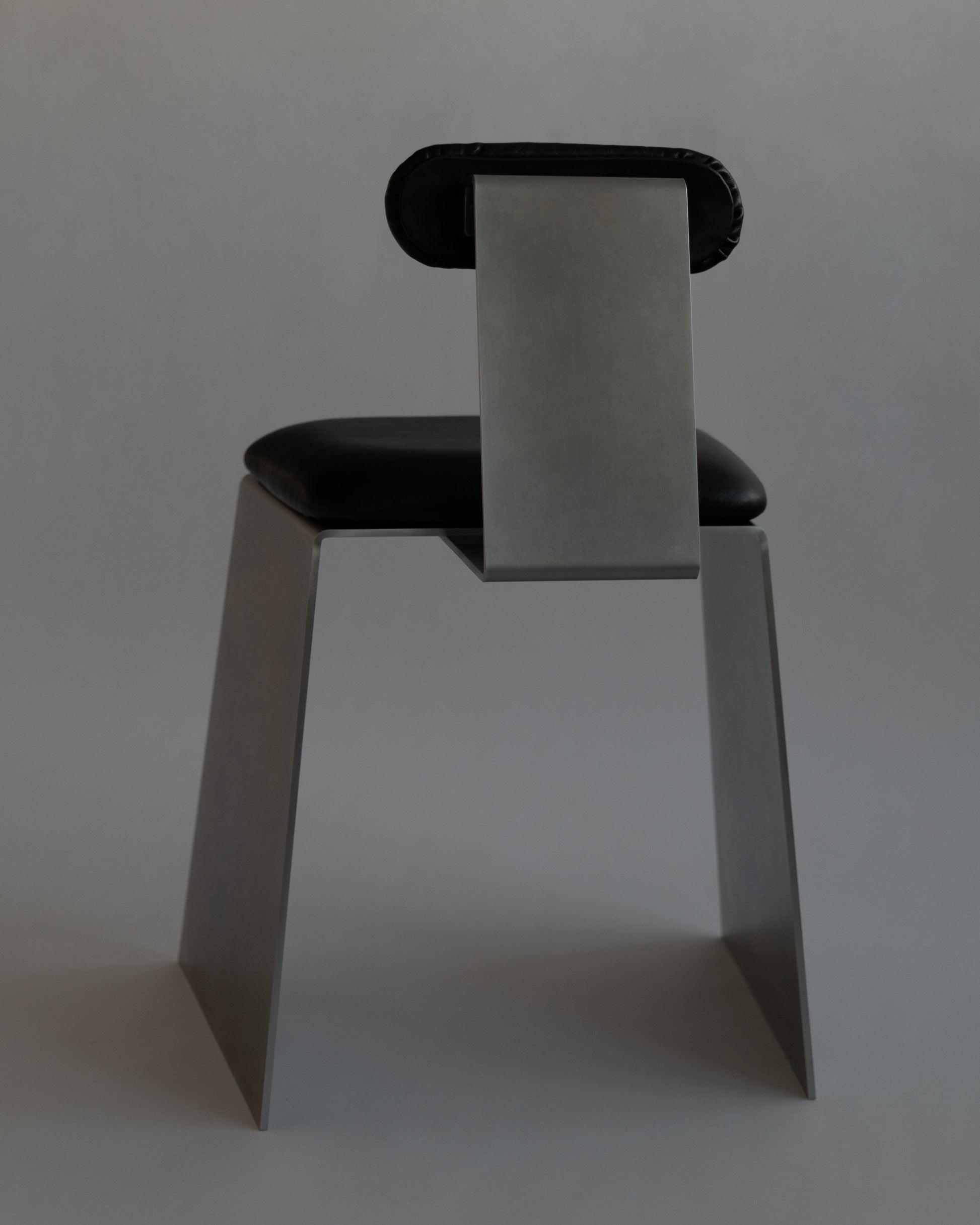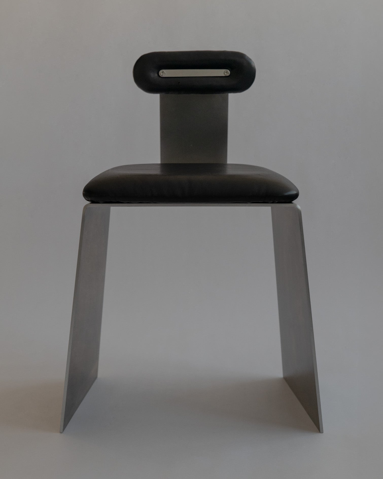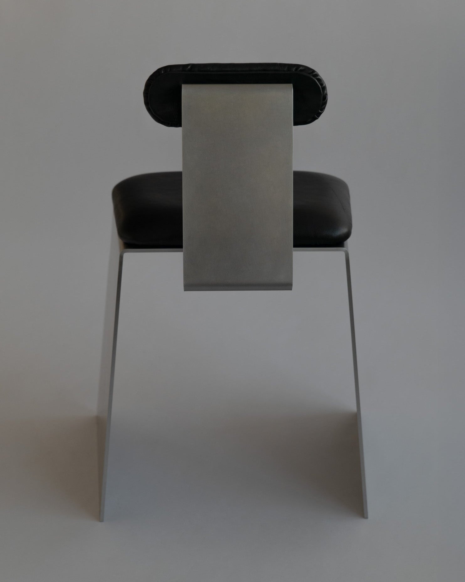Der „Void“-Aluminiumstuhl mit Ledersitz. Entworfen 2024 und gefertigt vom Künstler Jakub Kubica in seinem Atelier bei Berlin in einer nummerierten, limitierten Kollektion. Das Aluminium wurde handgeschliffen und mit natürlichem Bienenwachs vor Fingerabdrücken und Flecken geschützt, was die Pflege erleichtert.