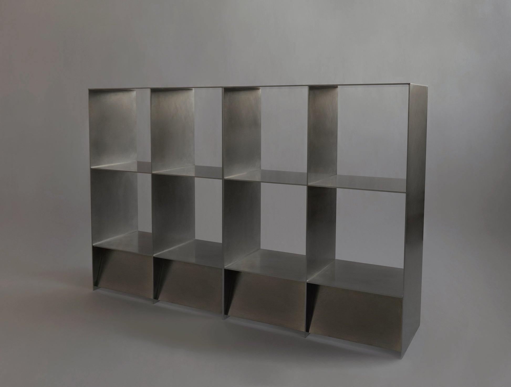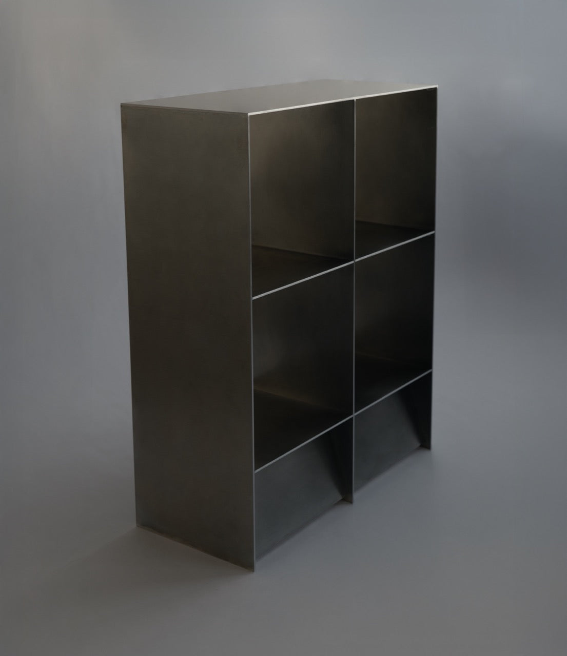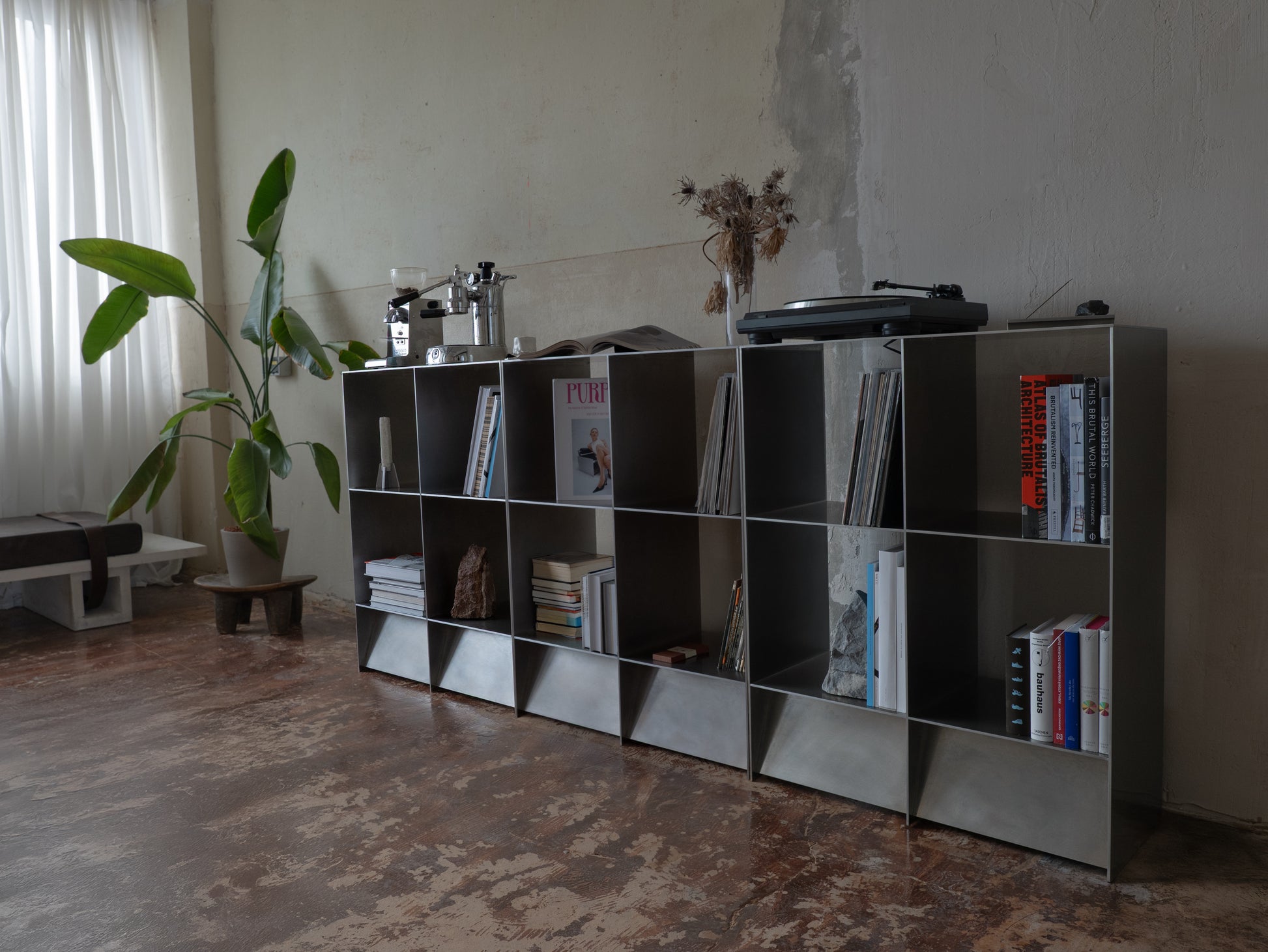 Das modulare System „Drone“ lässt sich in verschiedenen Anordnungen anordnen, um beispielsweise einen Konsolentisch, ein Regal oder einen Schrank zu schaffen. Entworfen im Jahr 2024 und gefertigt vom Künstler Jakub Kubica in seinem Atelier in der Nähe von Berlin, ist das Metall mit natürlichem Bienenwachs gewachst und handpoliert, um die Oberfläche vor Fingerabdrücken und Flecken zu schützen und die Pflege zu erleichtern. Bitte beachten Sie, dass alle Teile aufgrund der Handarbeit kleine Oberflächenfehler aufweisen können.
