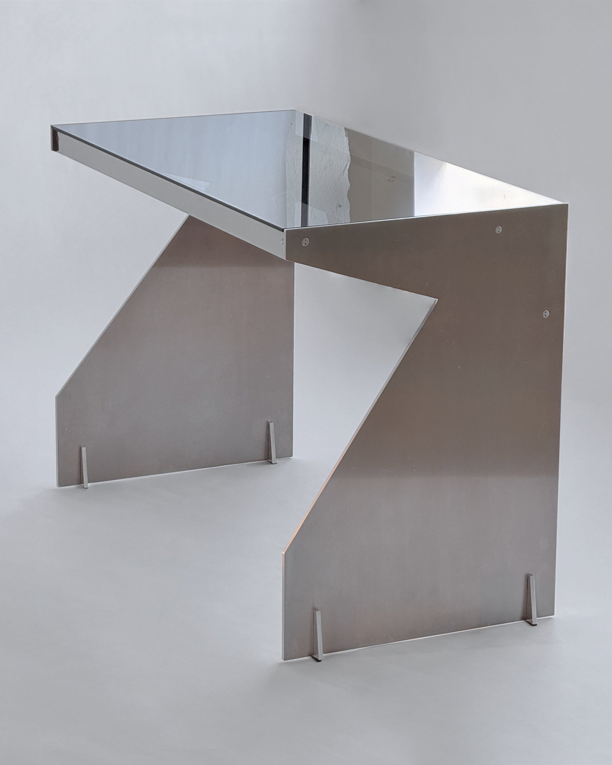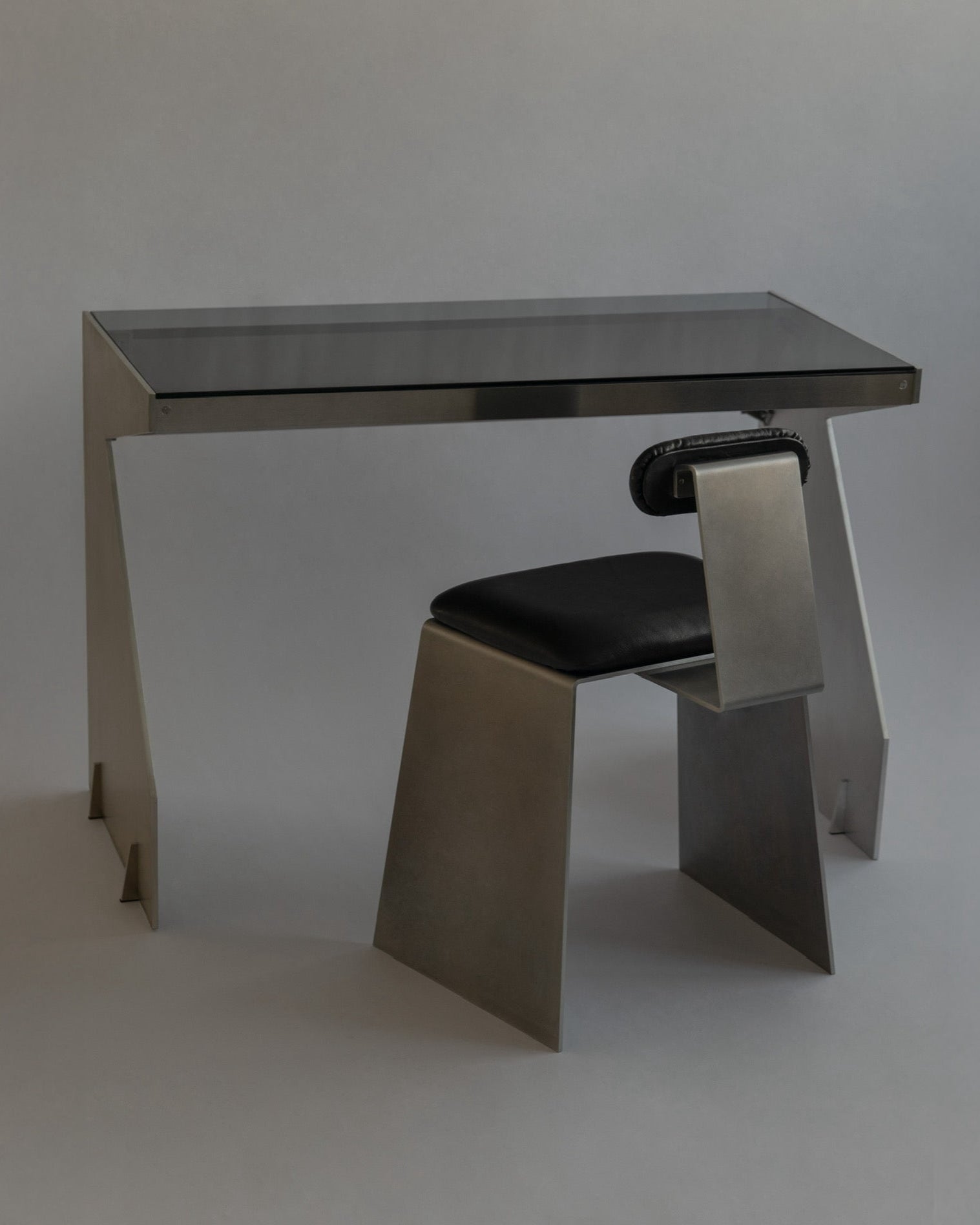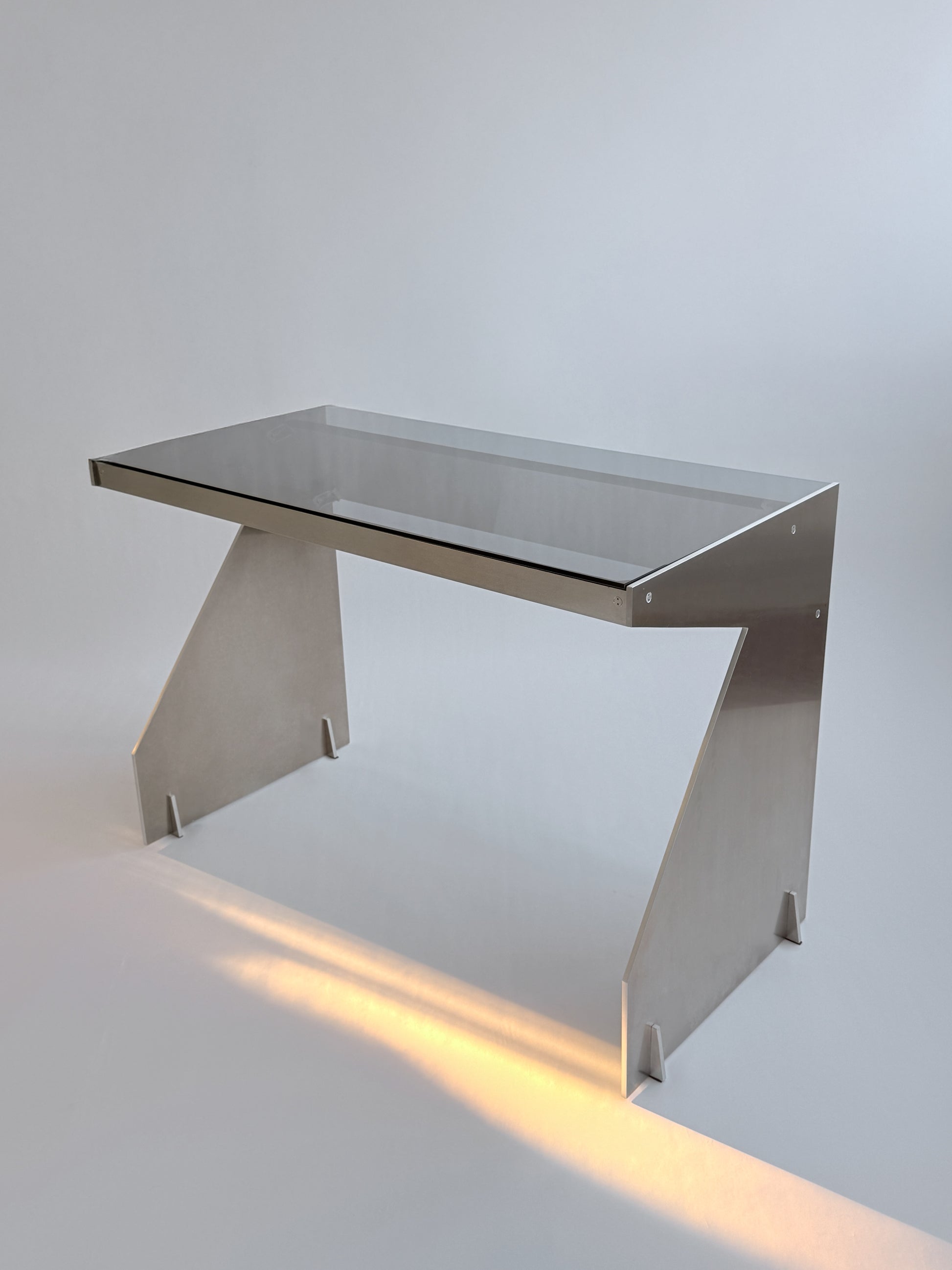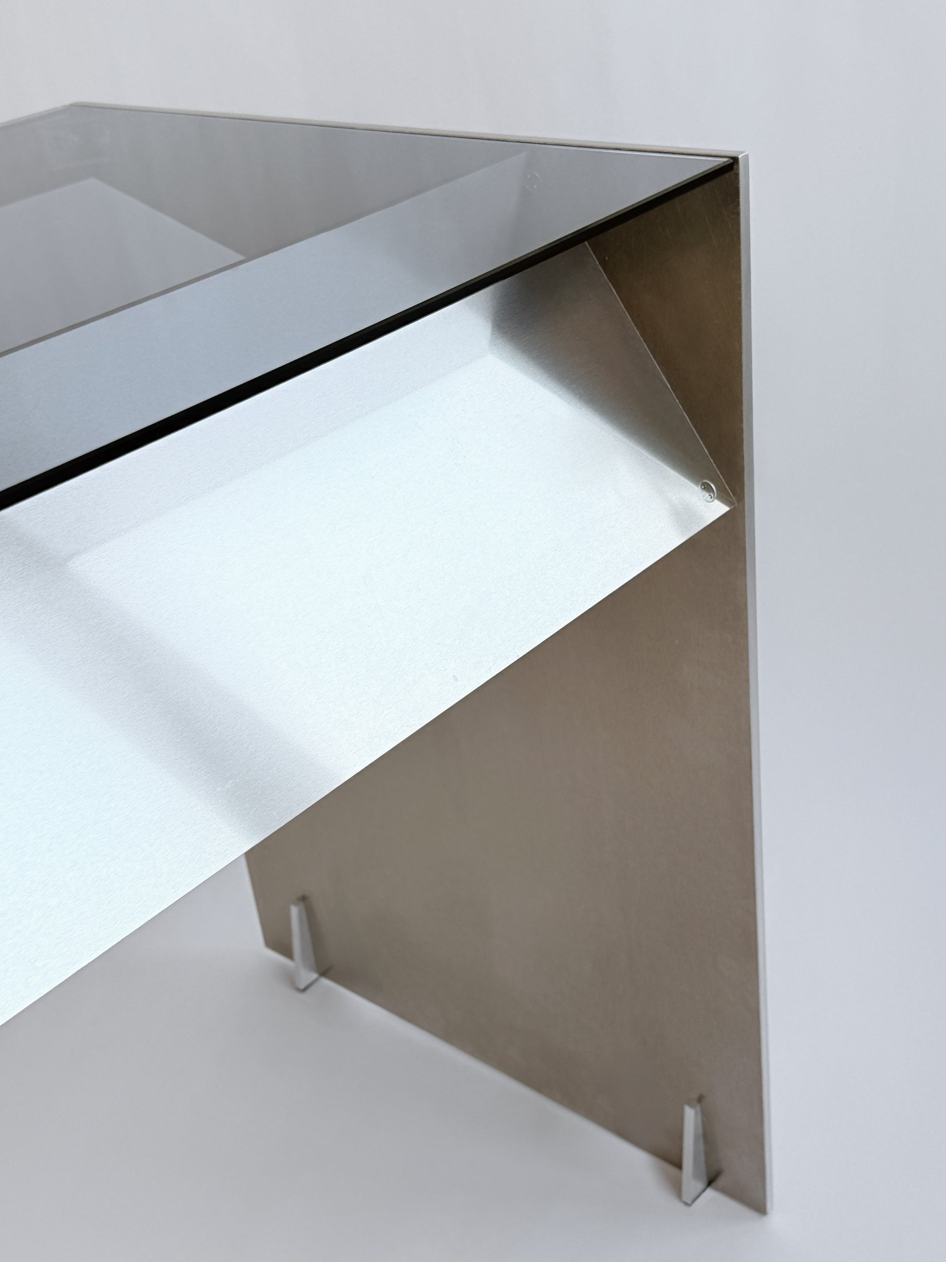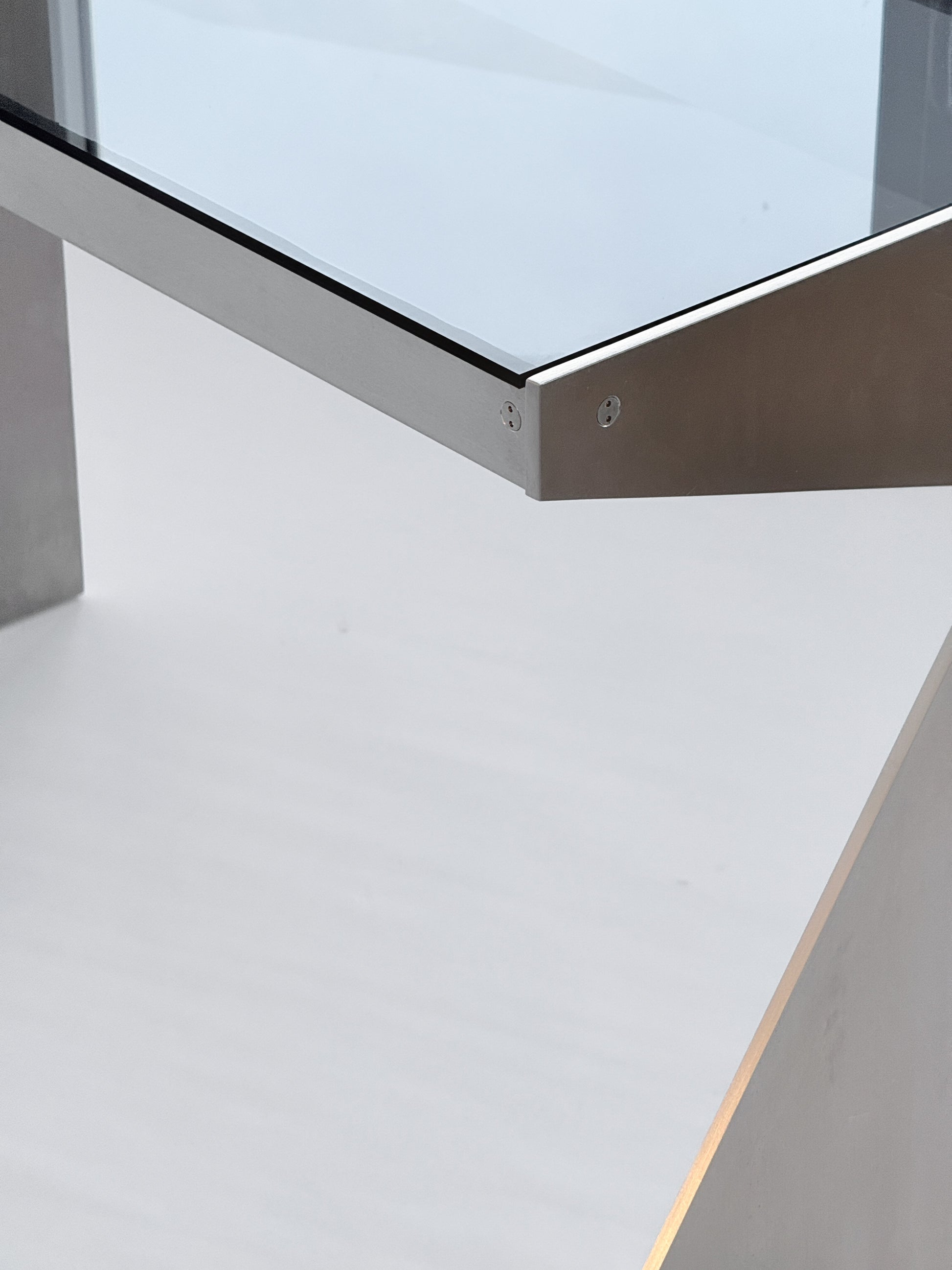 Der Pillar Tisch wurde 2022 vom Künstler Jakub Kubica entworfen. Das Tischgestell besteht aus einer massiven, 8 mm starken Aluminiumplatte, wobei zwei Säulen mit einer vertikalen Trockenverbindungstechnik verbunden sind. Die Tischplatte besteht aus robustem, langlebigem, 5 mm starkem, dunkel getöntem Glas. Der Tisch bietet Platz für bis zu 8 Personen und kann als Ess- oder Bürotisch genutzt werden. Hergestellt in unserem Atelier in der Nähe von Berlin in limitierter Auflage.