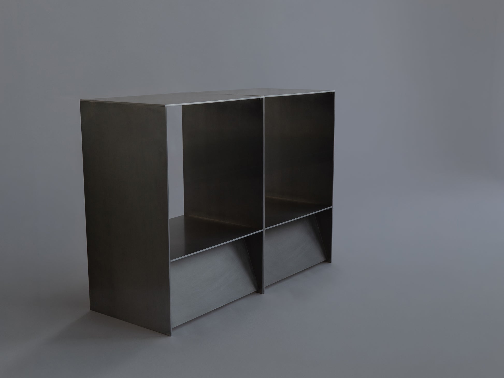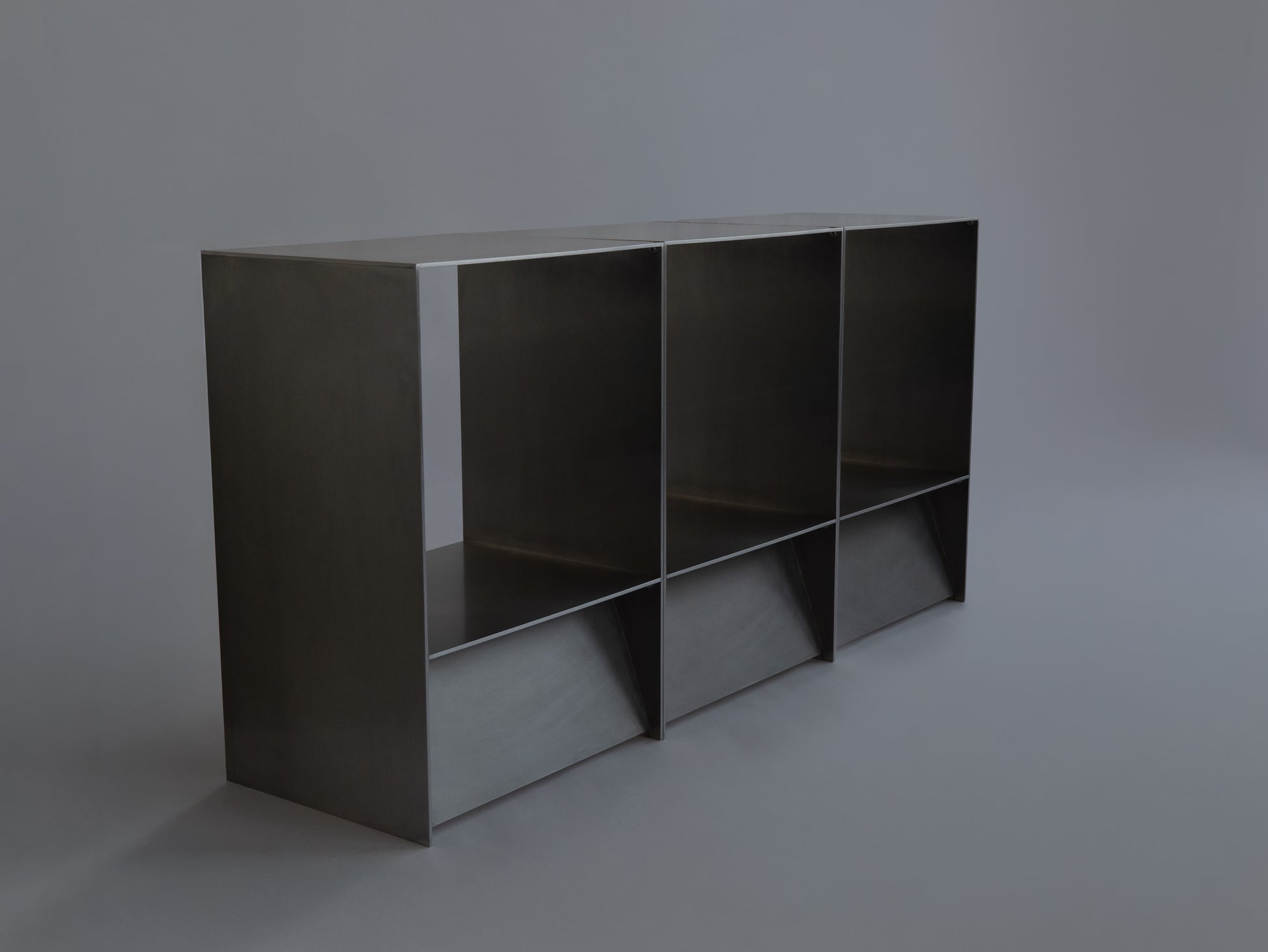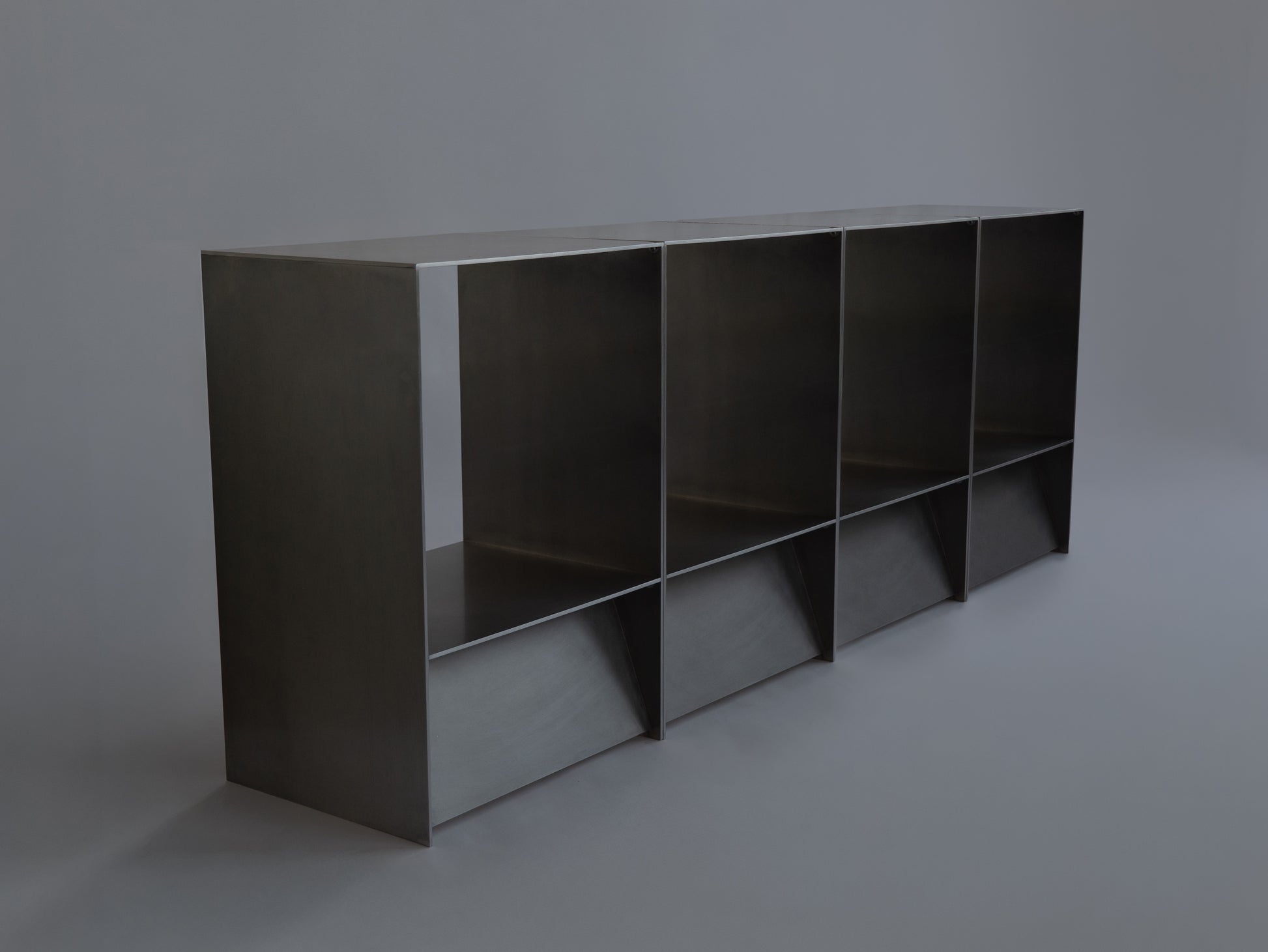 Das modulare System „Drone“ lässt sich in verschiedenen Anordnungen anordnen, um beispielsweise einen Konsolentisch, ein Regal oder einen Schrank zu schaffen. Entworfen im Jahr 2024 und gefertigt vom Künstler Jakub Kubica in seinem Atelier in der Nähe von Berlin, ist das Metall mit natürlichem Bienenwachs gewachst und handpoliert, um die Oberfläche vor Fingerabdrücken und Flecken zu schützen und die Pflege zu erleichtern. Bitte beachten Sie, dass alle Teile aufgrund der Handarbeit kleine Oberflächenfehler aufweisen können.