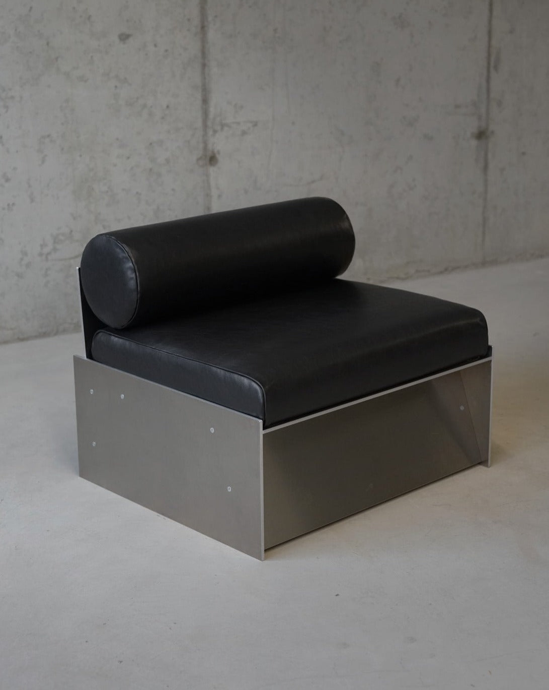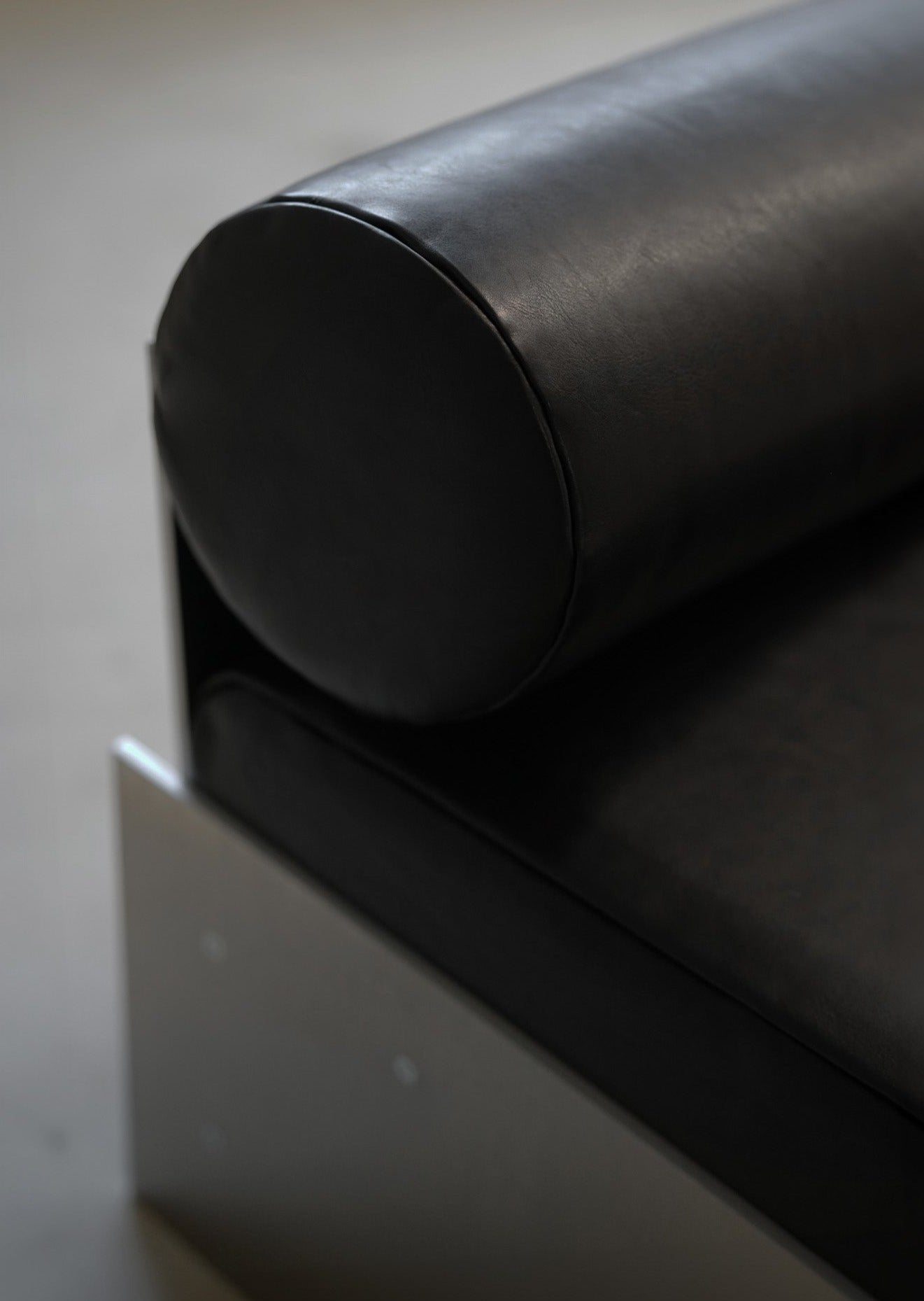 Der Sofasessel „Drone“ mit pflanzlich gegerbten Ledersitzen. Entworfen 2024 und gefertigt vom Künstler Jakub Kubica in seinem Atelier bei Berlin in einer nummerierten, limitierten Kollektion. Der Sessel bietet komfortables Sitzerlebnis, ohne seine minimalistische Ästhetik zu beeinträchtigen. Er lässt sich in verschiedenen Anordnungen anordnen, beispielsweise zu einem Doppelsitzer-Sofa. Das Metallskelett ist mit natürlichem Bienenwachs gewachst und handpoliert, um die Oberfläche vor Fingerabdrücken und Flecken zu schützen und die Pflege zu erleichtern.