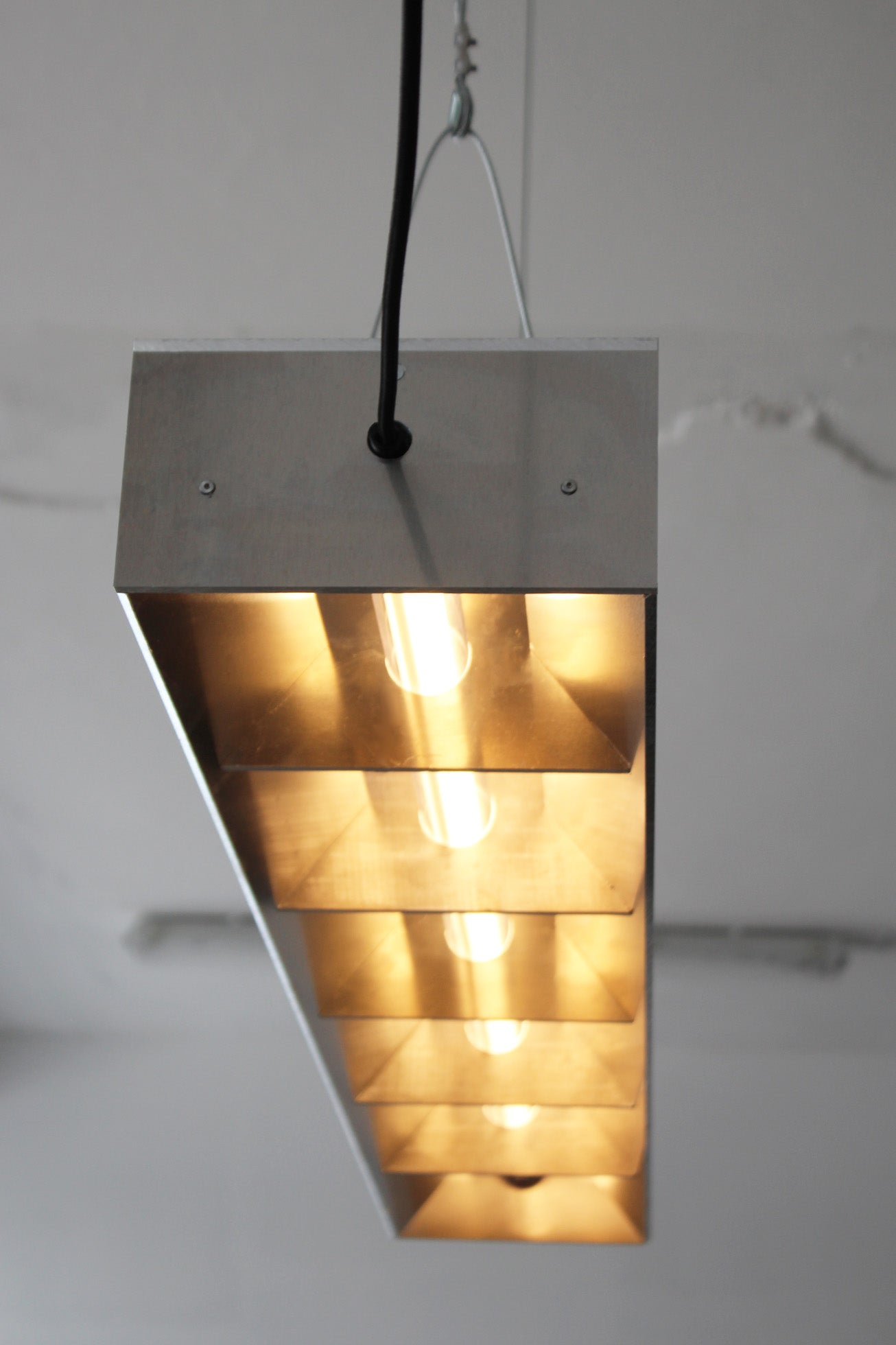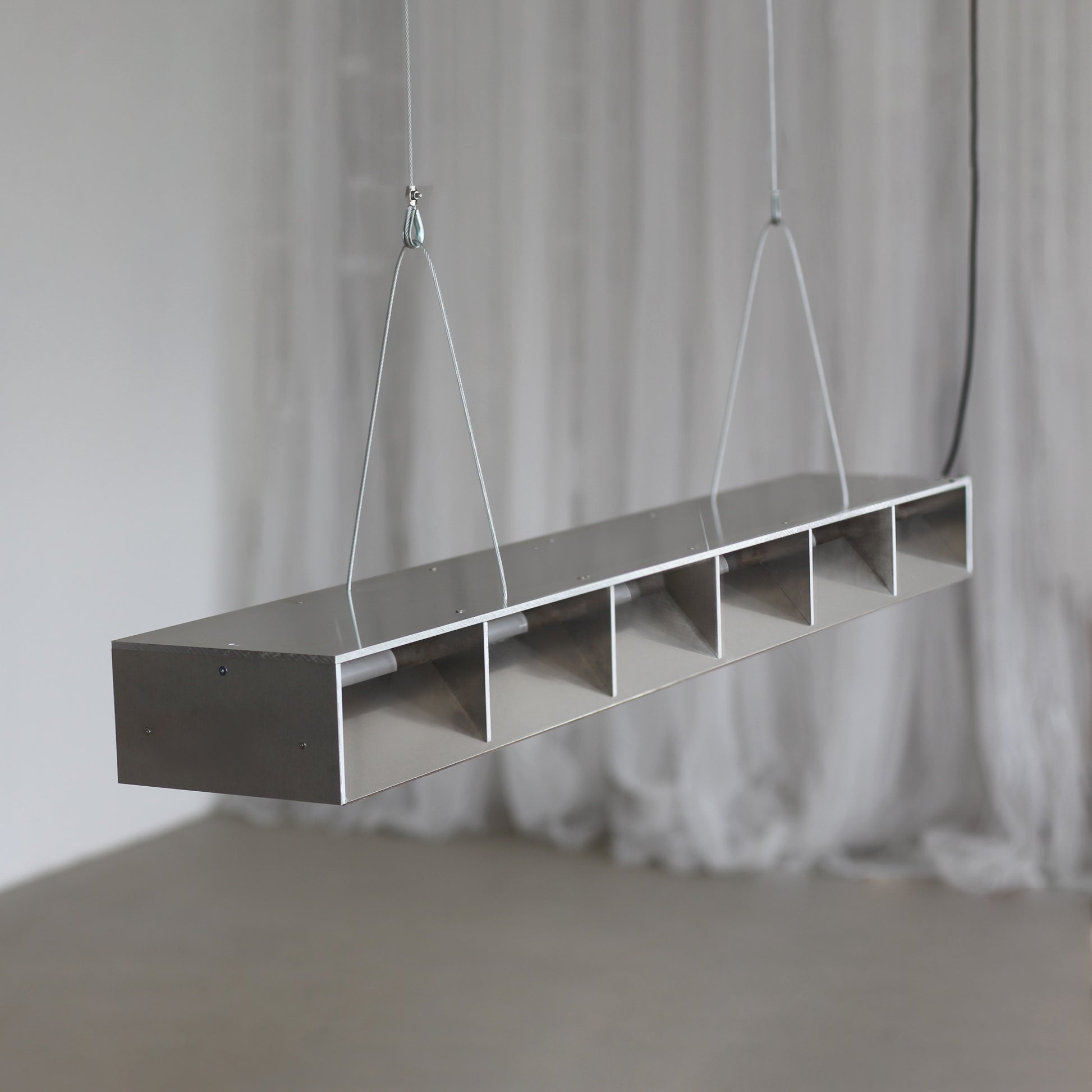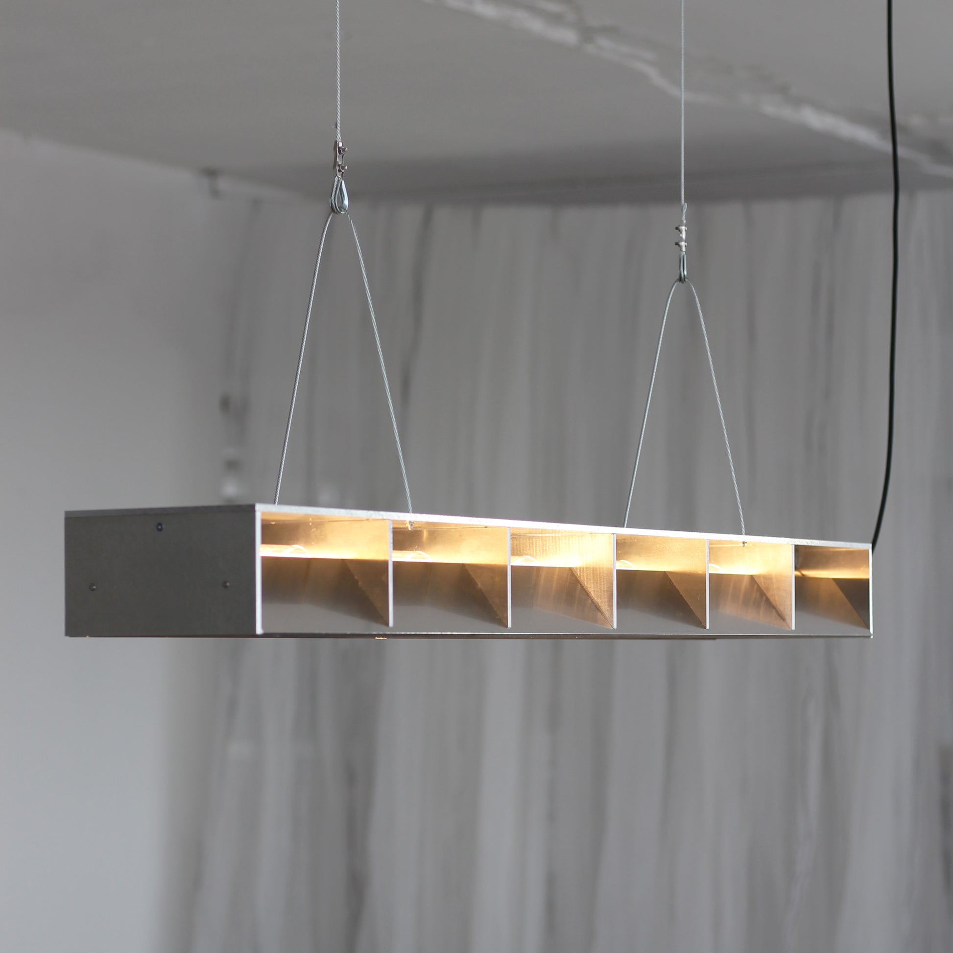 Entworfen 2023 von Jakub Kubica. Die Leuchte wird in unserem Atelier in der Nähe von Berlin aus 6 mm starkem Aluminium gefertigt. Stahldrähte sorgen für stabilen Halt, und die Kabellänge kann auf Anfrage individuell angepasst werden. Mit 18 Watt warmweißem LED-Licht (1650 Lumen) eignet sich dieses vielseitige Stück perfekt zur Beleuchtung Ihres Wohnbereichs oder über Ihrem Ess- oder Küchentisch.