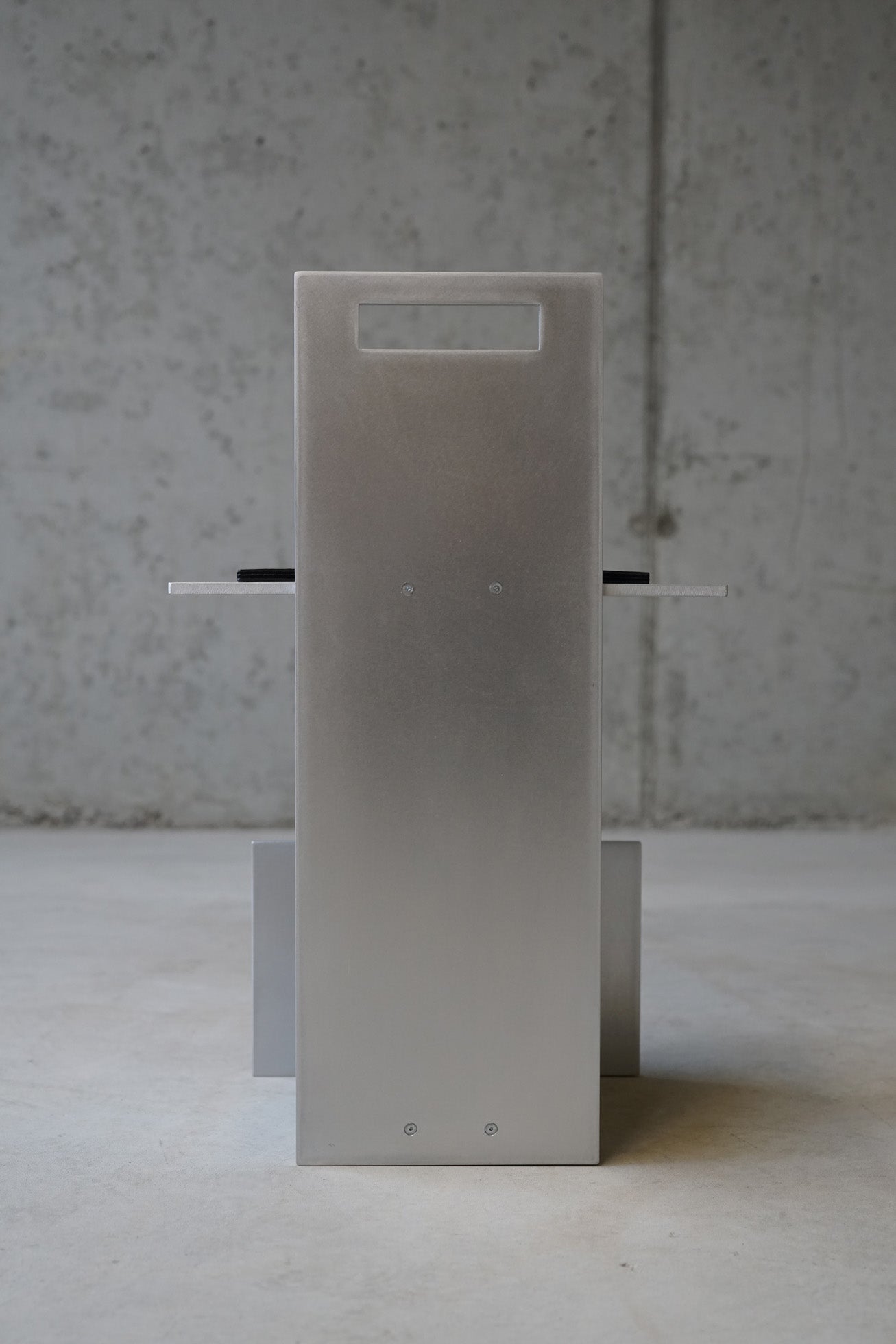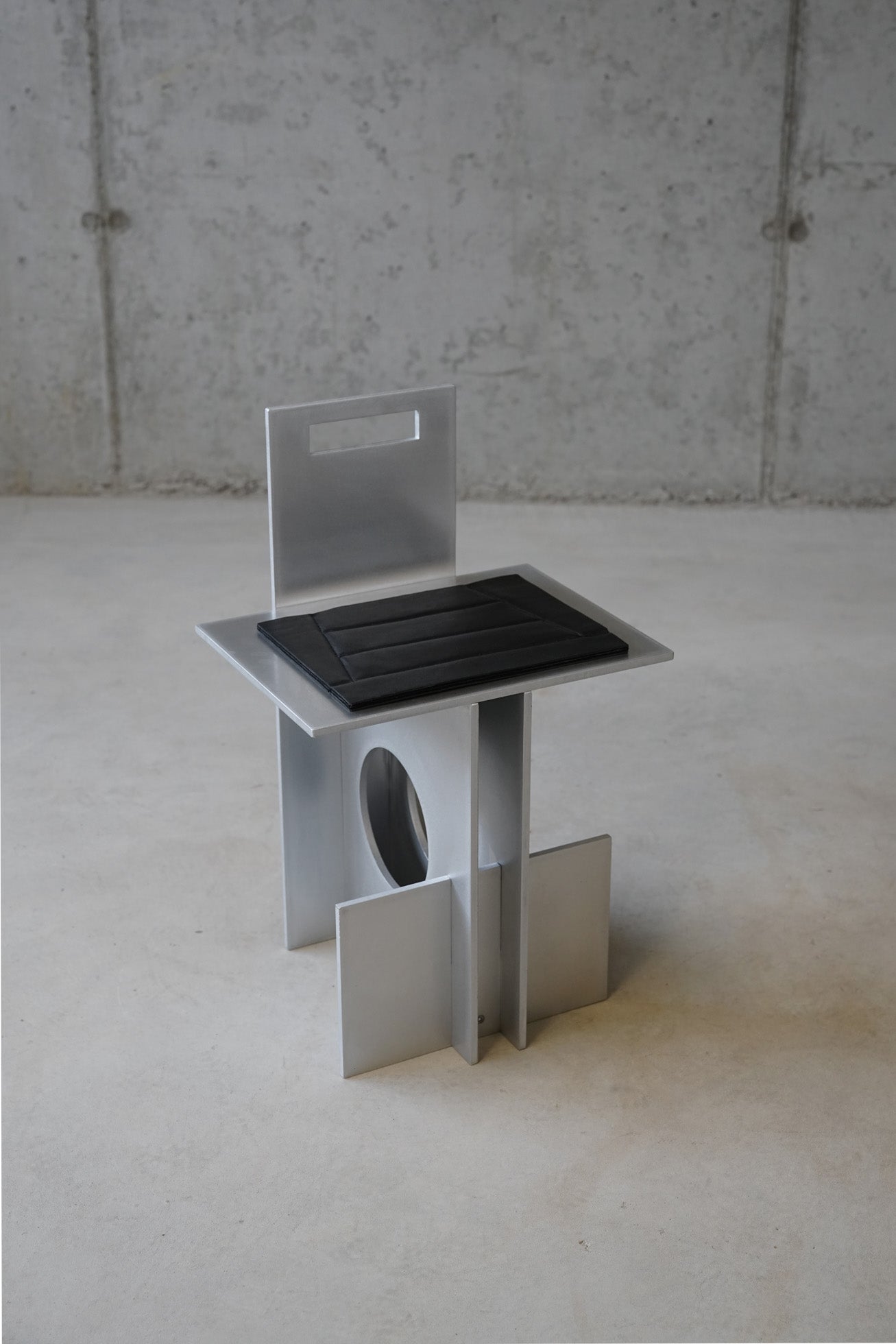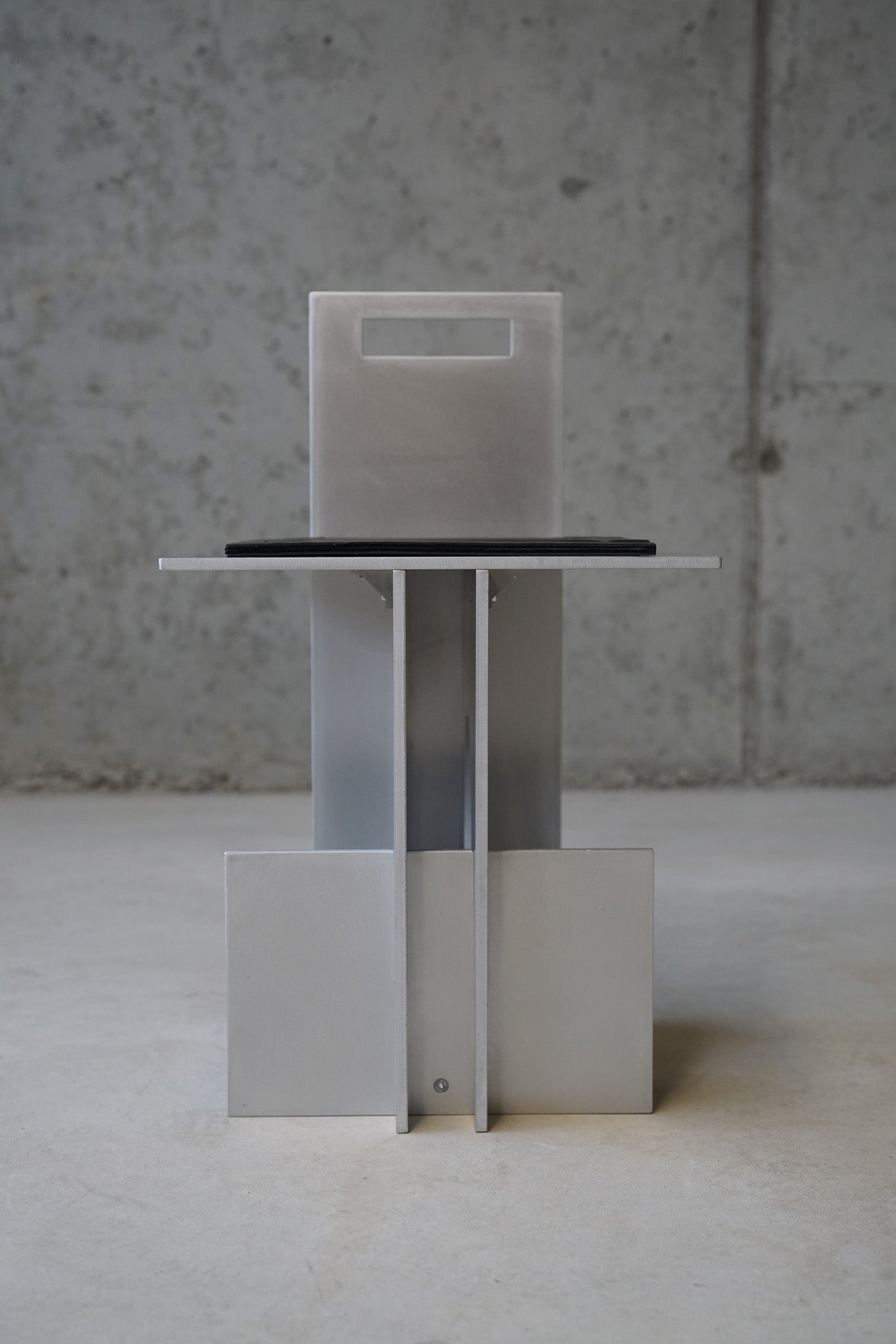 Der „Void“-Aluminiumstuhl mit Ledersitz. Entworfen 2024 und gefertigt vom Künstler Jakub Kubica in seinem Atelier bei Berlin in einer nummerierten, limitierten Kollektion. Das Aluminium wurde handgeschliffen und mit natürlichem Bienenwachs vor Fingerabdrücken und Flecken geschützt, was die Pflege erleichtert.