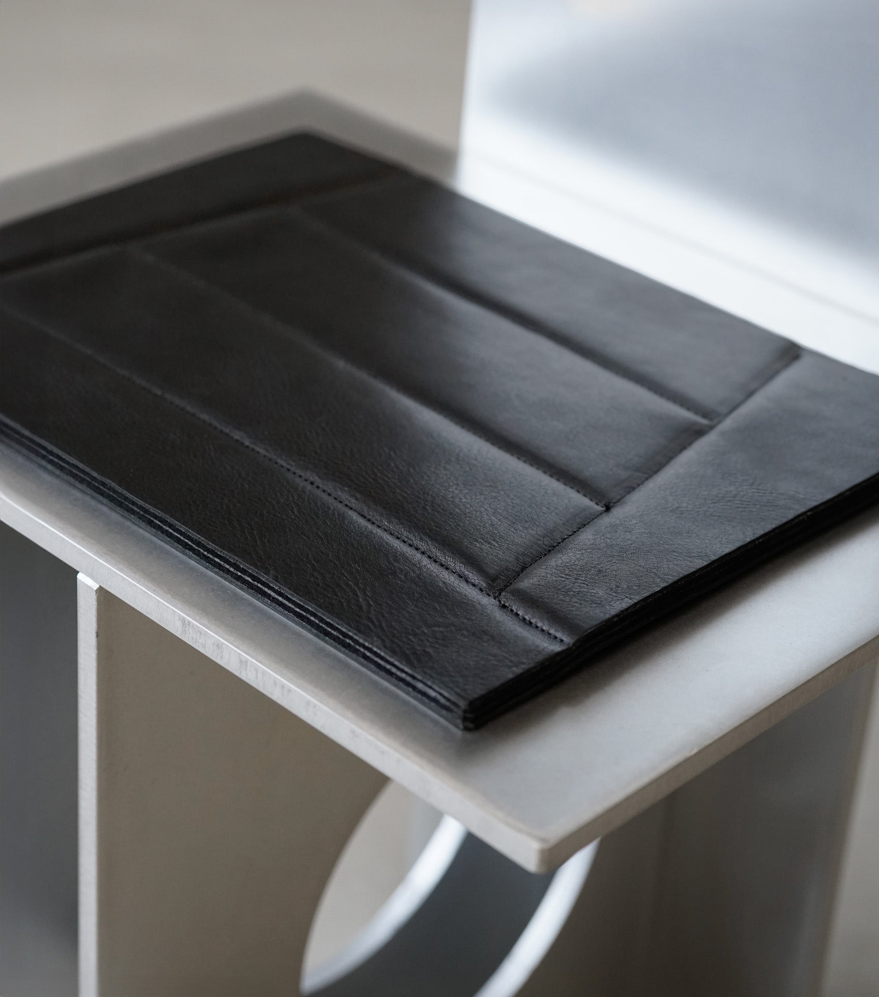 Die 1 cm dicke Sitzfläche ist mit Bio-Filz gepolstert und beidseitig mit pflanzlich gegerbtem Leder aus der Toskana, Italien, vernäht. Das Kalbsleder ist durchgefärbt, mit Wachs behandelt und für mehr Weichheit gewalkt. Dank seiner zeitlosen Optik und der schönen Alterung wirkt das Leder sehr natürlich und einzigartig.