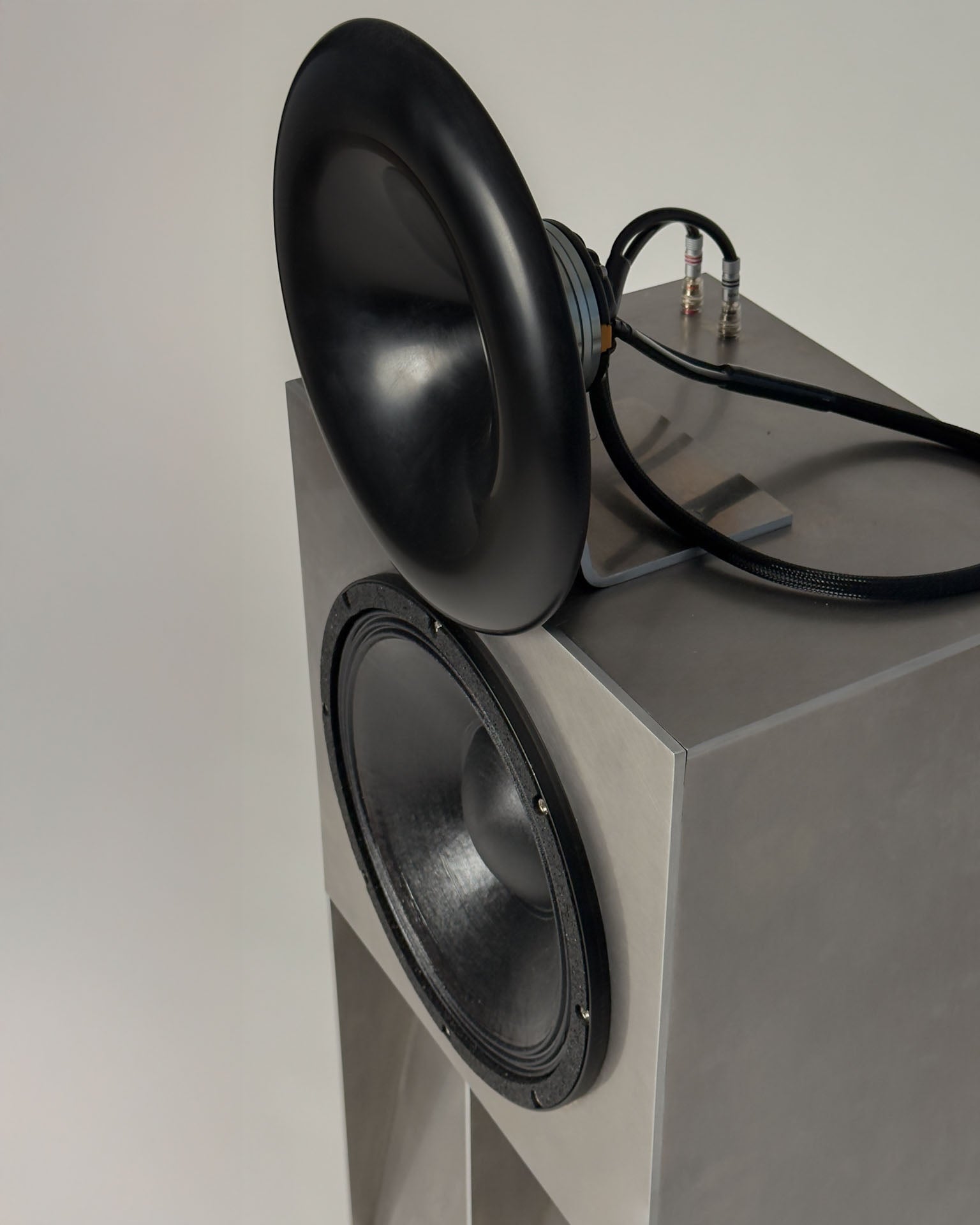 The raw aluminium enclosure employs MDF/butyl constrained layer damping reinforced by steel bracing to eliminate resonances, ensuring no audible colouration. The flat on-axis response and controlled off-axis behaviour provide a smooth, detailed, lifelike presentation across musical genres, and also make Aluma suitable as a high-end studio monitor. With ultra-low nonlinear distortion, even at high SPLs, Aluma is capable of reproducing audio equally faithfully at levels suitable for the home, studio, or nightclub/venue.